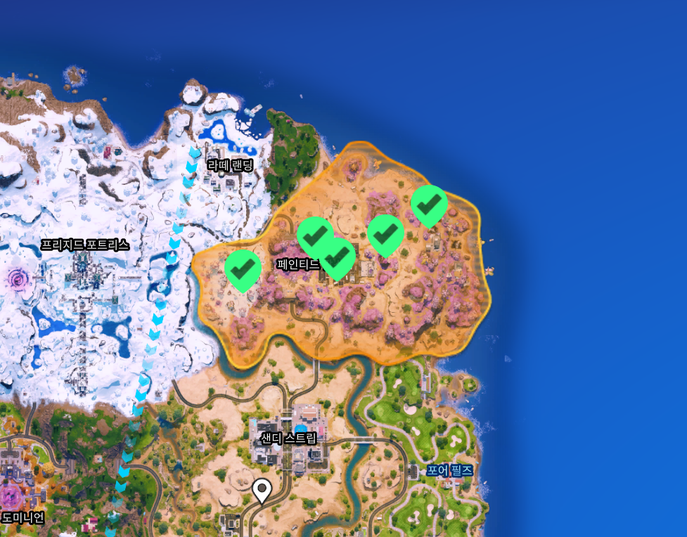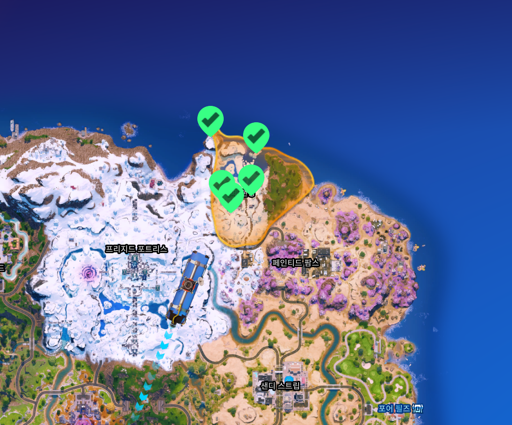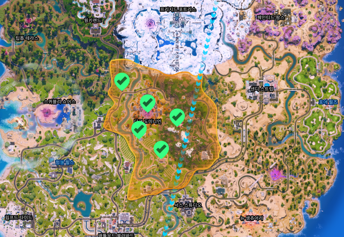 포트나이트 배틀로얄 챕터7 시즌2 의 보이저의길 카오스큐브 위치 지도.